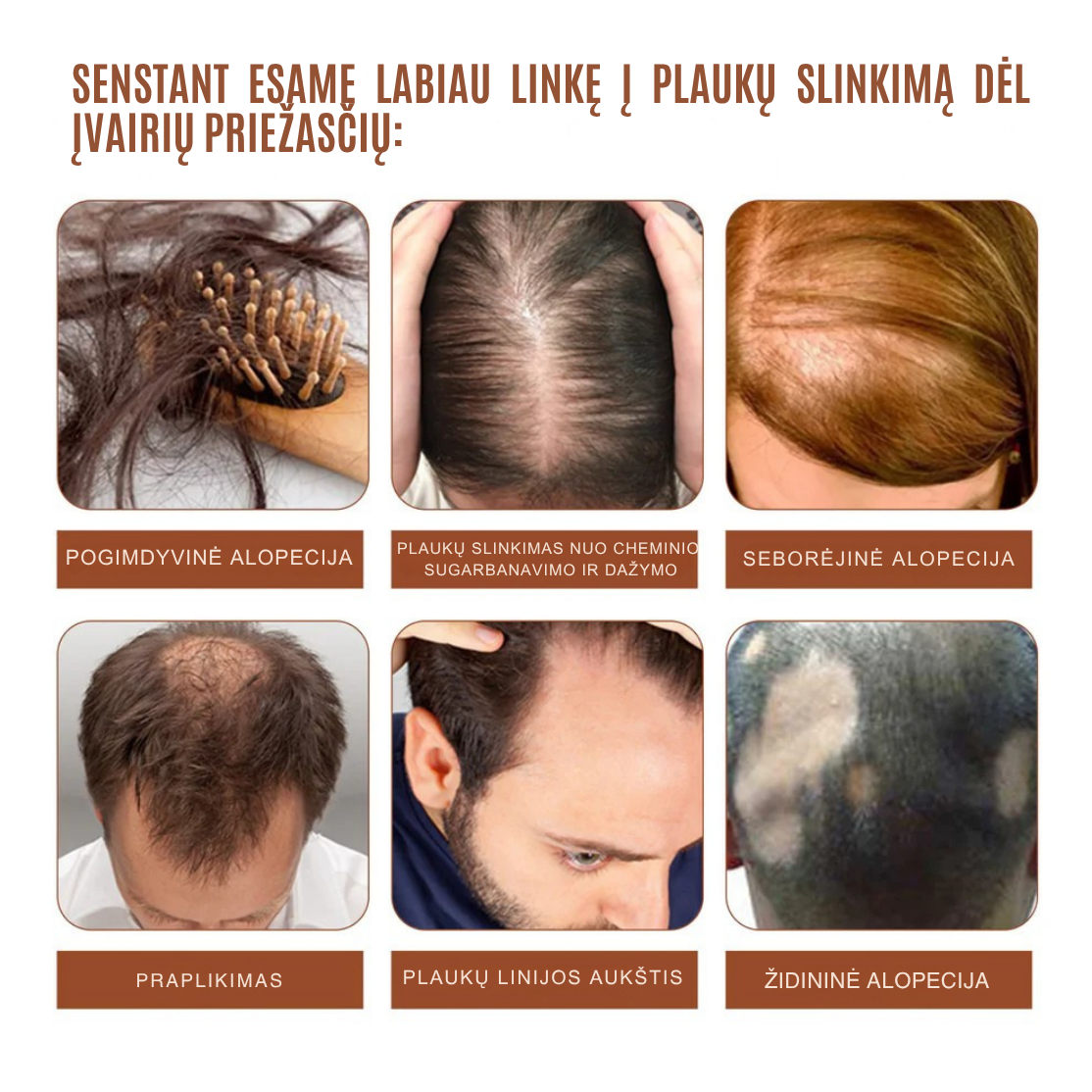 • Prieš ir po nuotraukos rodo: mažiau slinkimo, storesni plaukai, ryškesnė plaukų linija.