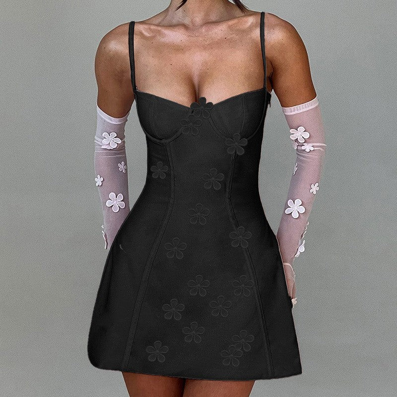 Ši trumpo kirpimo suknelė su gėlių raštu ir subtiliomis petnešėlėmis – puikus pasirinkimas ieškančioms švelnaus moteriškumo ir šiuolaikiško stiliaus.